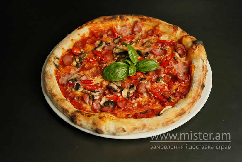 Гостра піца на основі соусу маргарита, з сиром моцарелла, салямі, копченими ковбасками, беконом, печерицями та базиліком.
