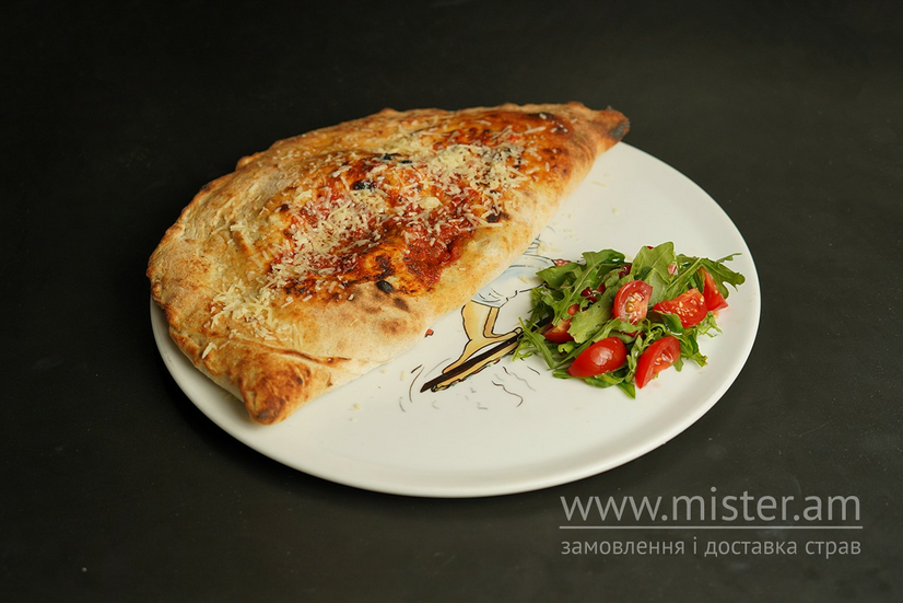 Закрита піца з соусом бешамель, моцареллою, копченою шинкою, печеними печерицями, томатами та пармезаном. Подаємо з руколою та помідорами чері.