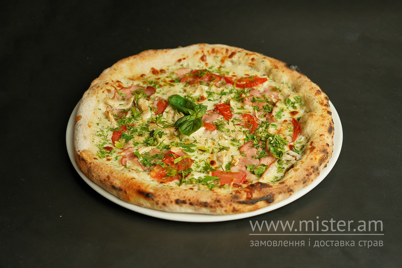 Соус бешамель, моцарелла, копчена шинка, варене курча, томати. Доповнюємо часниковою олією, зеленню та базилік.