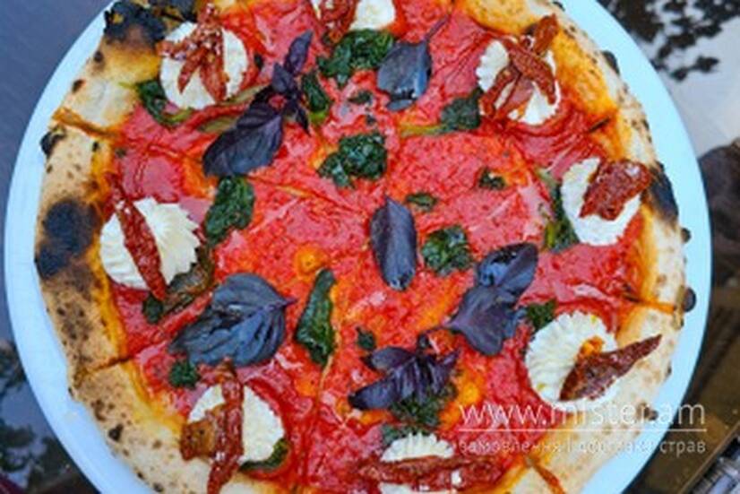 На основі соусу Маргарита, шпинату. Доповнюємо сиром рікотою, в`яленими томатами, оливковою олією, лимонним соком.