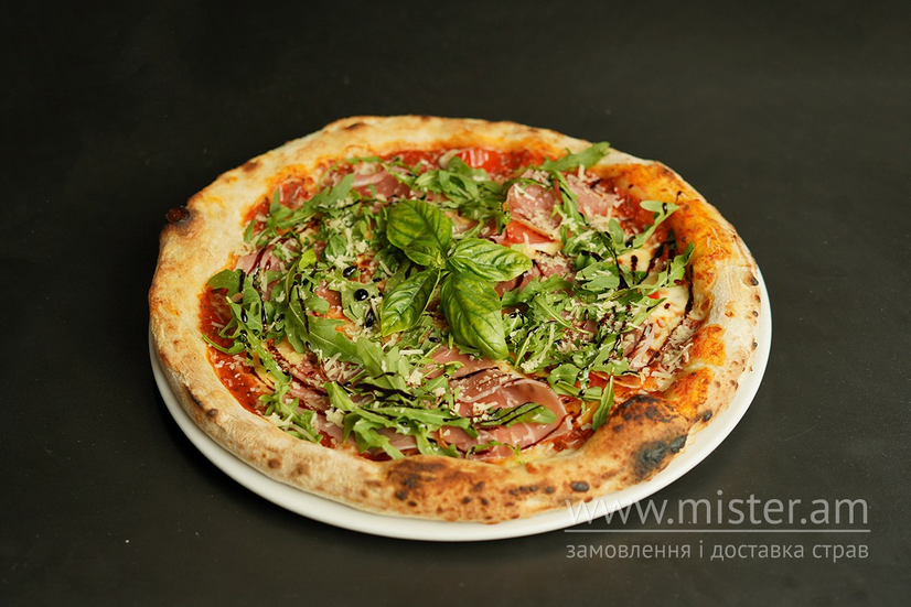 Фірмова піца з пармою, пармезаном, руколою, томатами чері, оливковою олією та соусом понті. В основі соус маргарита та моцарелла.