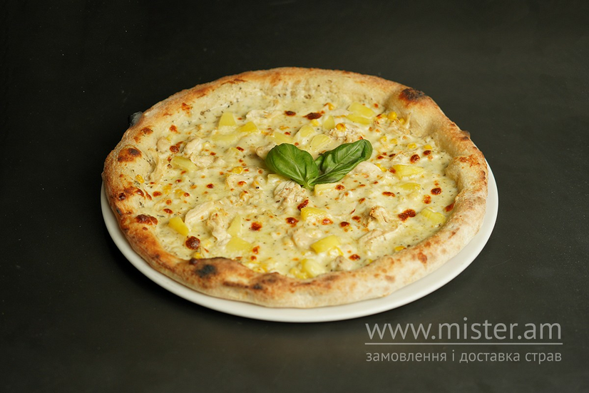 Соус бешамель, моцарелла, варене курча, соковитий ананас, кукурудза та базилік.