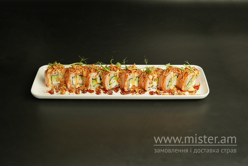 Обпалений лосось з соусом унагі, цибулею кранч та соусом айолі. Всередині крем сир, огірок та авокадо. Посипаємо приправою тогараші.