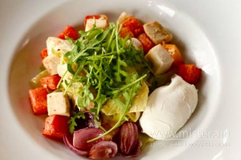 Теплий салат з куркою, запеченим гарбузом та яйцем пашот
