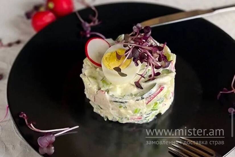 Свіжа редиска, огірок, хрустка капуста, кисломолочний сир, яйце, зелень, цибуля зелена, приправляємо сметаною.