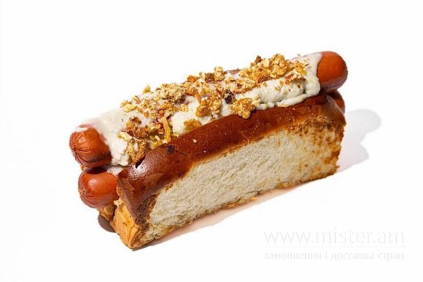 З молочною сосискою та соусом дорблю у булочці бріош.