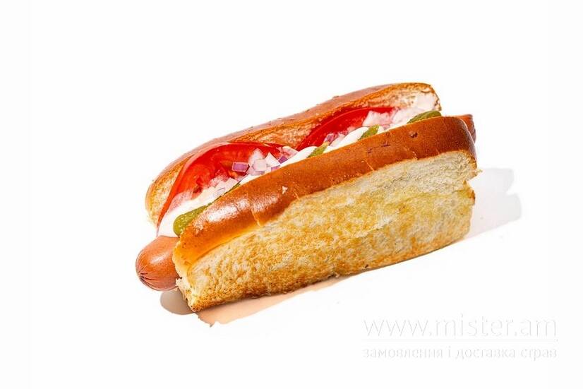 З молочною сосискою, корнішонами, томатами, червоною цибулею, кетчупом та гірчицею у вершковому бріоші.