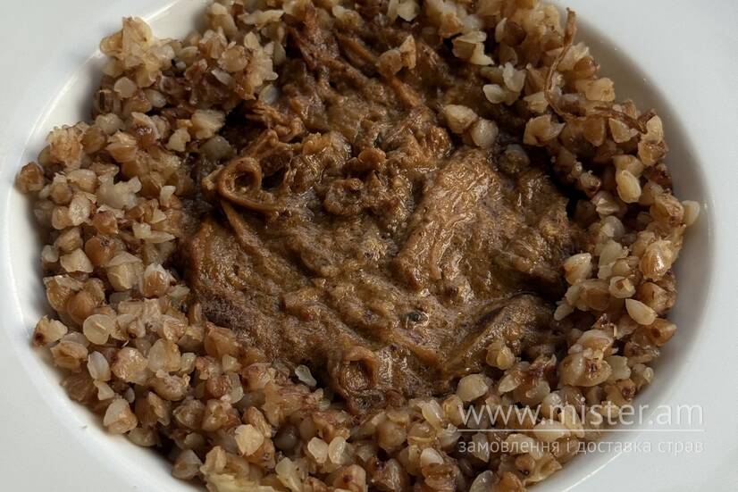 Соковита свинина з білими грибами і трюфелем у вершковому соусі, подається з ніжною гречкою.