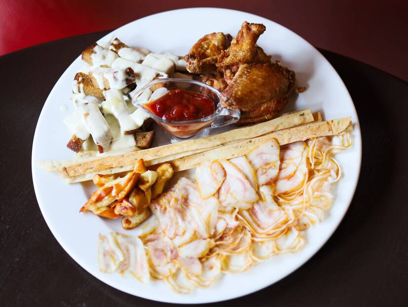 Копчені вушка, чеські сухарики, курячі крильця, смажений чечель, фірмові пивні палички та соус.