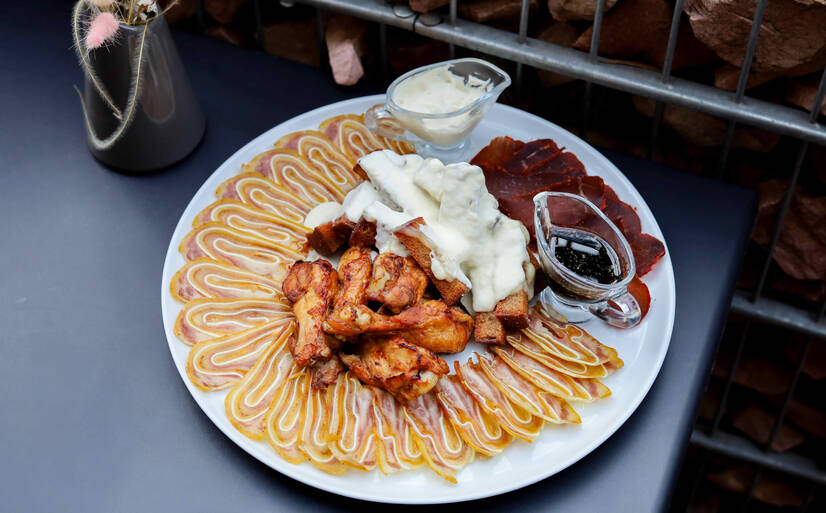 копчені вушка, сухарики по-чеськи, курячі крильця, бастурма, соус буфало та соєво-часникова олійка
