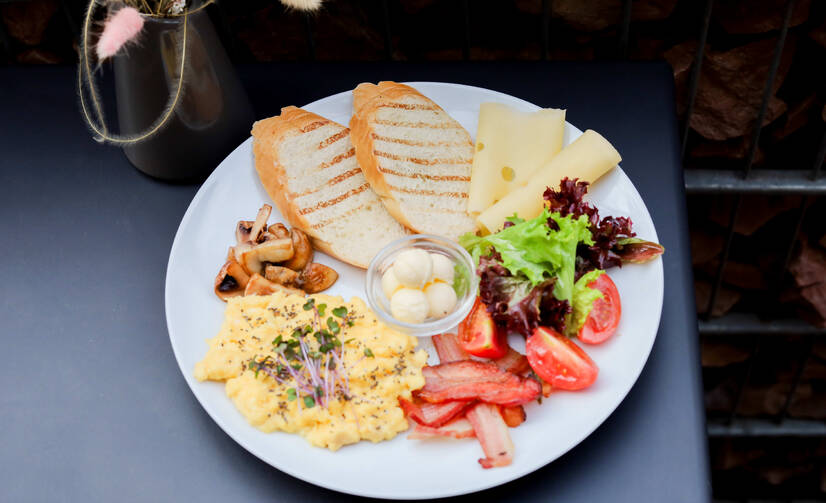 ніжний скрембл, рум’яний бекон, смажені печериці, сир, хрусткий багет із маслом та свіжий салат із томатами