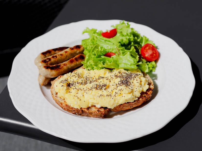 ніжний яєчний скрембл, що подається на тості, з фірмовими грильованими ковбасками та міксом салату