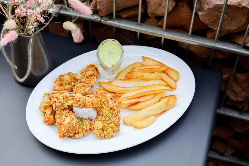 Філе білої риби в хрусткій скоринці з картопляними діпами та соусом Цезар
