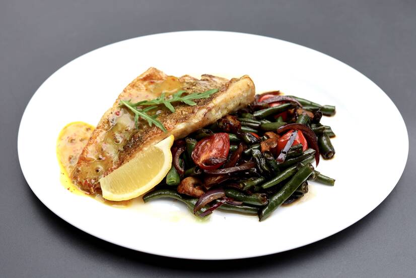 Ресторація Бравий Швейк Смажений морський окунь з шпарагівкою, печерицями та томатами чері