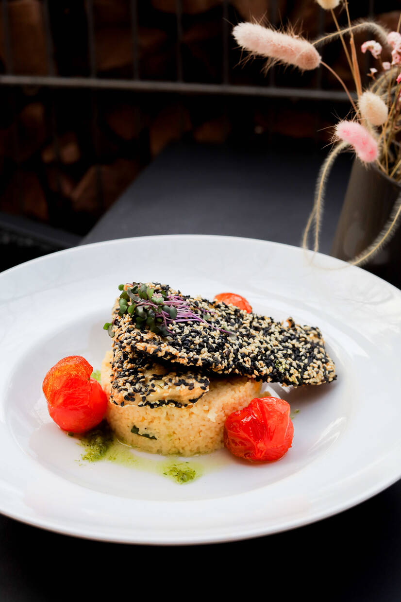 ніжне філе хеку в хрусткій кунжутній скоринці, подається з ароматним овочевим кус-кусом, томатами чері та зеленою олією