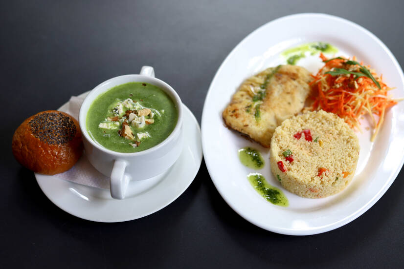 Ніжний шпинатний крем-суп, філе хеку,ароматний кускус з овочами та вітамінний салат