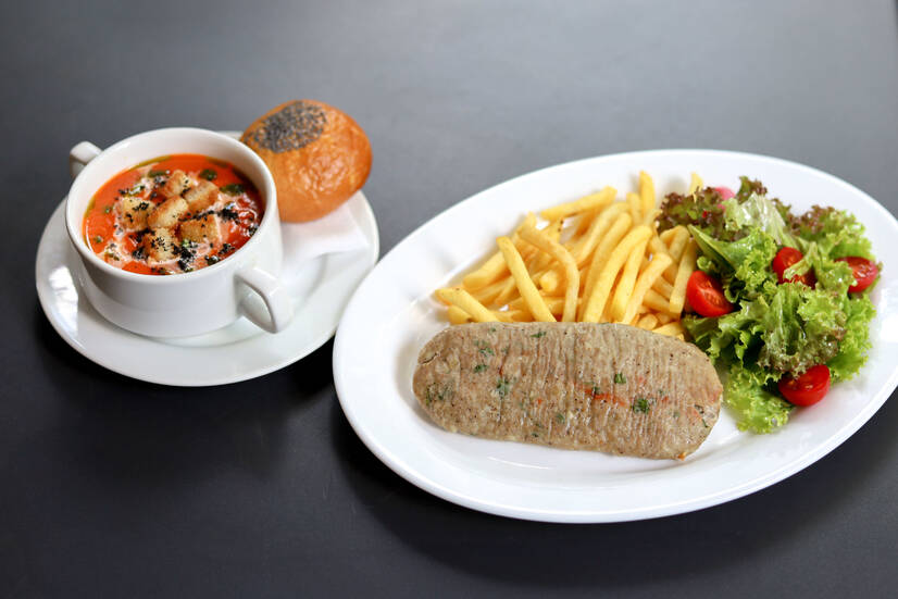 Томатний крем-суп з ароматними грінками, соковитий свинний кебаб,хрустка картопля фрі та овочевий мікс-салат