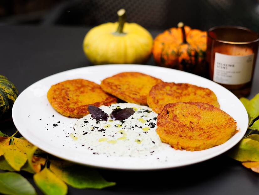 золотисті деруни з гарбуза та картоплі, подані з освіжаючим йогуртово-огірковим соусом