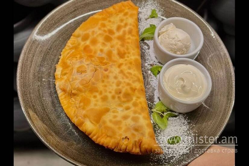 Ніжний, соковитий чебурек з вишнею. Подаємо з кулькою морозива та сметаною.