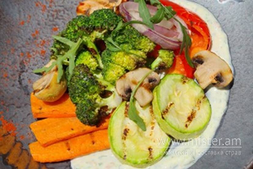 Соковиті запечені овочі на хоспері (кабачок, перець болгарський, морква, томати, печериці, цибуля Марс), доповнені пікантним соусом на основі грецького йогурту.