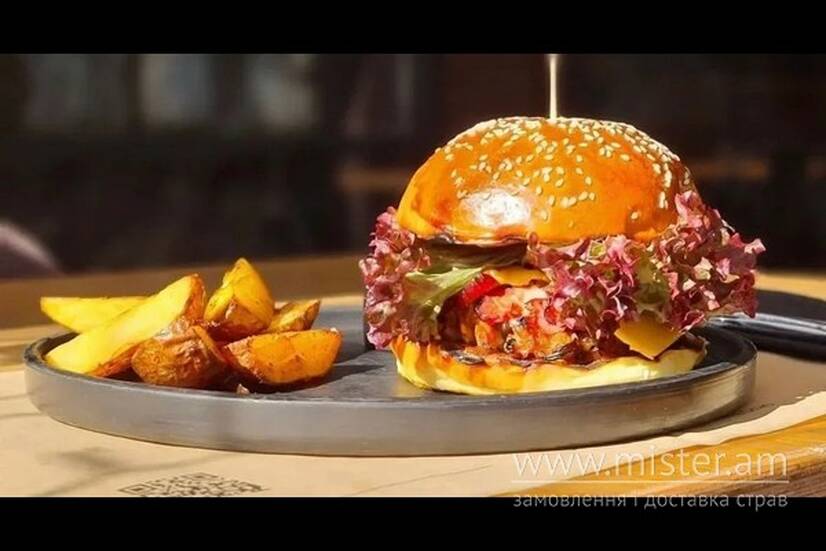 Бургер приготовлений з рваної свинини, карамелізованих печериць та цибулі, печеного бекону та сиром чеддер, додаємо руколу та соус BBQ. Подаємо з запеченою картоплею та соусом BBQ.