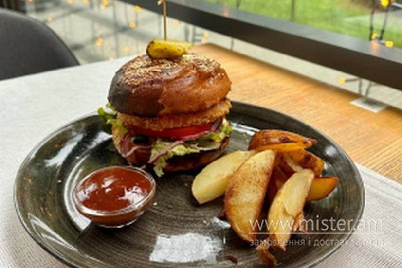 Запечена булочка зі смаженою курячою котлетою на хоспері, всередині з сиром. Доповнена маринованою синьою цибулею, свіжими томатами, листям салату та соленим хрустким огірком в поєднанні з соусом до бургера. Подається з запеченою картоплею та соусом BBQ.