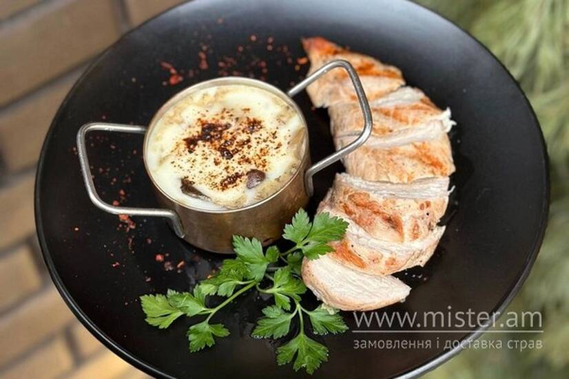 Соковите куряче філе запечене на хоспері з картопляною запіканкою у поєднанні з лісовими грибами під сирною шапкою.