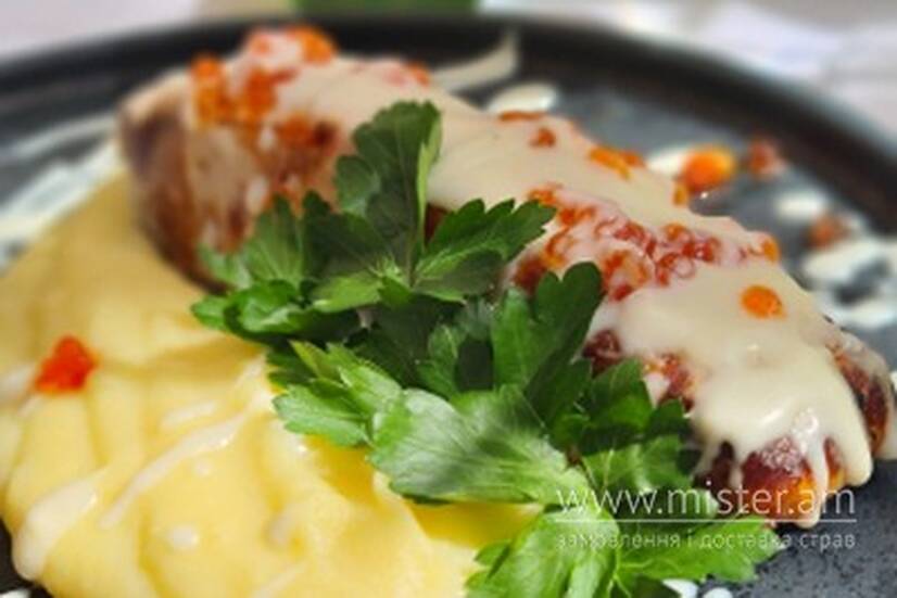 Стейк з лосося запечений в хоспері подається з ніжним картопляним пюре та поливається соусом на основі вершків та червоної лососевої ікри.