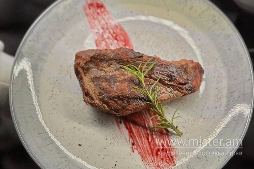 Стейк з яловичої лопатки вологої витримки з додаванням спецій.