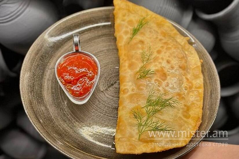 Соковитий чебурек з м`ясом молочної телятини та свинини, в поєднанні з домашнім плавленим сиром, копченим беконом та лісовими грибами. Подається з гострим соусом.