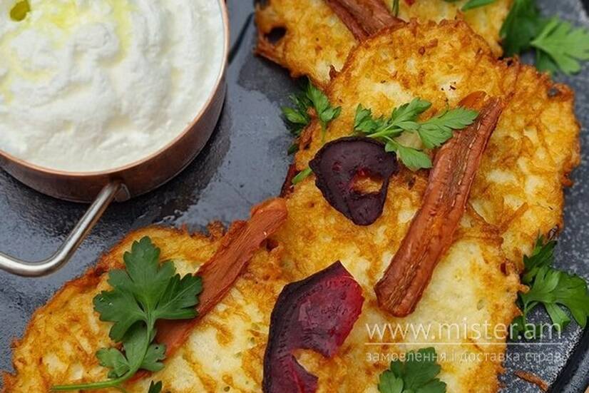 Деруни фаршировані язиком, смажені до хрумкої скоринки. Подаються зі сметанною піною.