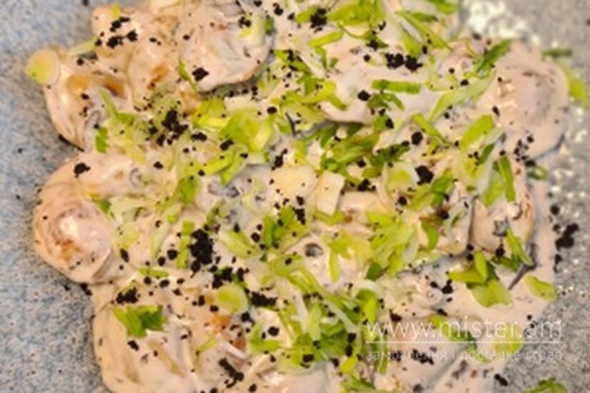 Смажені варенички з м'ясом тушковані в вершково грибному соусі.