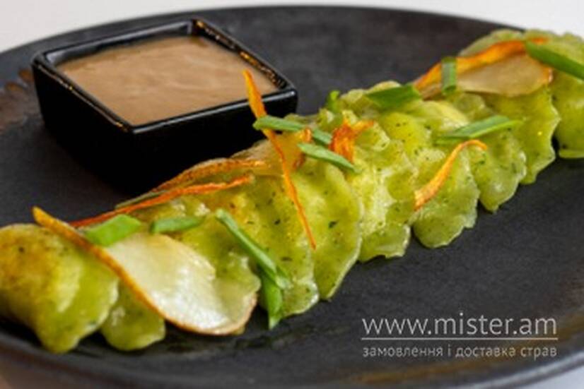 Вареники виготовлені шляхом згортання прісного тіста. Начиняємо рубленим курячим філе з додаванням свіжої груші, гострого перцю чилі та вершкового масла. При подачі підсмажуються та подаються з карамелізованою грушею, горіховим соусом, чіпсами з болгарського перцю та зеленою цибулею.