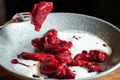 Вареники виготовлені шляхом згортання прісного тіста. Начиняємо соковитою вишнею. Подаємо сметанною піною та ягідним гелем.