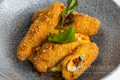 Ніжне куряче філе фаршироване твердим сиром, в’яленими томатами, вершковим маслом та свіжим шпинатом. Паніруємо в сухарях Панко та смажимо до золотої скоринки. Подаємо з баношем та зеленим маслом.