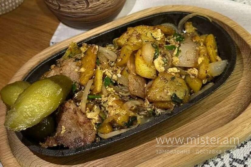 Смажене домашнє м`ясо та бочок, доповнюємо картоплею, цибулею та яйцем. Подаємо з квашеним огірком.