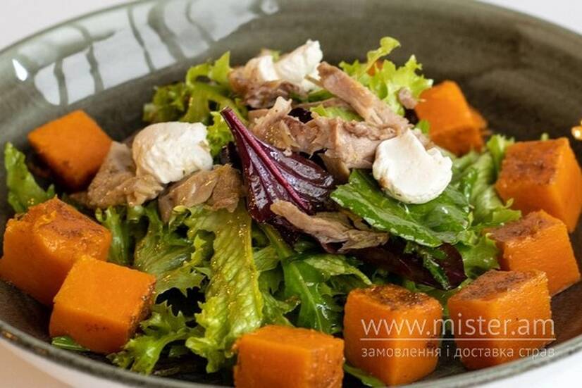 Рване м`ясо качки у поєднанні з листям салату, печеним гарбузом з корицею та мусом з крем-сиру. Заправляємо легким пікантним соусом.