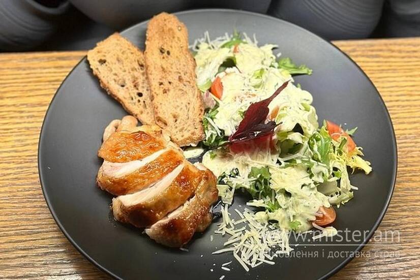 Поєднання ніжного, соковитого курячого м`яса з нотками апельсину та меду ,в поєднанні з хрустким листям салату, соковитих томатів чері, заправлений салатним соусом з зеленню та часником.