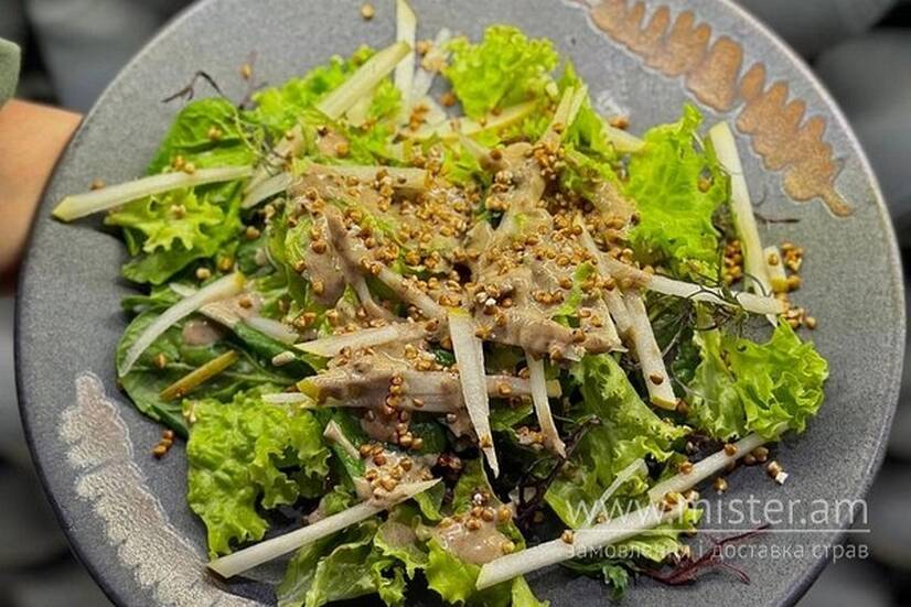 Салат з томленою курячою печінкою в вершках, бренді, червоному сухому вині з міксом салату, грушею, мусом з крем сиру та вершків. Доповнений попкорном з гречки.