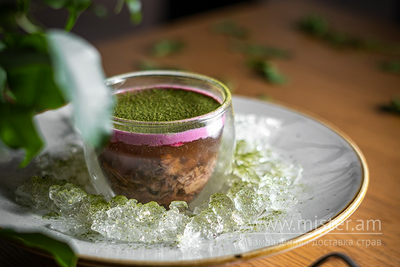 Домашній холодець на основі яловичини та свинини, спецій, лаврового листа та часнику. Доповнений мусом з хрону, вершків та пудри з зелені. Подається з печеною картоплею, маслом та зеленню.