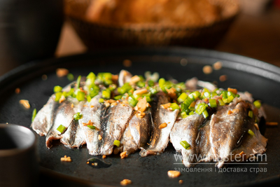 Кілька пряного посолу з олією та спеціями. Подається на смаженій слайсами картоплі. Доповнена зеленою цибулею.