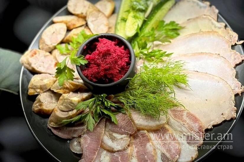 Два види домашньої ковбаси власного виробництва (свинна домашня печена ковбаса та індича з домашнім плавленим сиром та вяленими томатами), свинина запечена в хоспері зі спеціями,печений бочок хойшин, доповнені огірком з часником та зеленню, та червоним хроном.