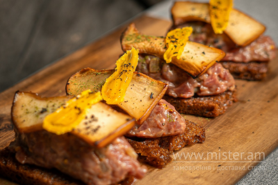 Рублена яловичина з цибулею Марс, соленим огірком, діжонською гірчицею та томатним соусом. Подається на темних підсушених хлібцях натертих часником. Зверху, смажені гриби ерінги, чорний домашній майонез з часниковою олією, в’ялений жовток та земля з маслин.