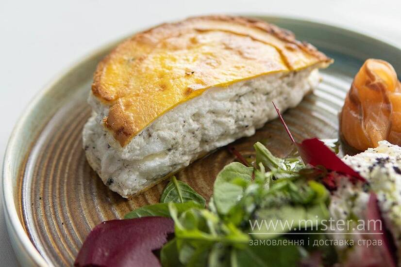 Ніжний повітряний омлет, сир сулугуні, лосось гравлакс, мус з фети, мікс салату та томати.