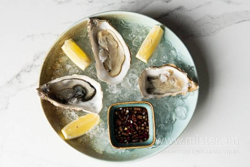 Тріо Ваших улюблених устриць з соусом на вибір (устричний, імбирний, бальзамік з кримською цибулею). Рекомендуємо для тих хто куштує вперше.