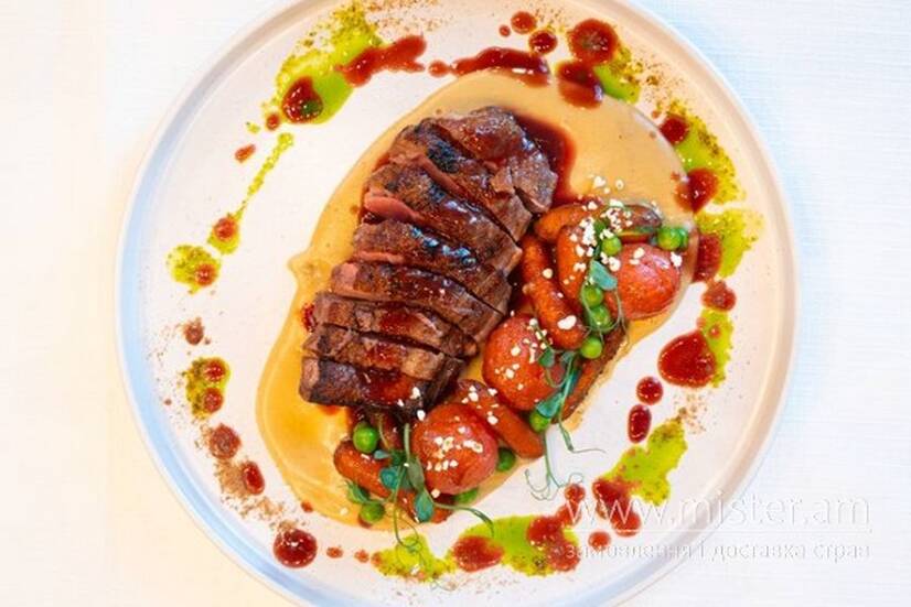 З картопляним мусом, овочами та цитрусовим деміглясем.