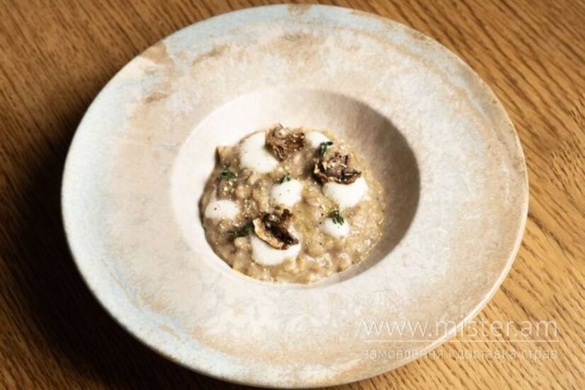 Ризото з додаванням сушених та свіжих білих грибів подається з соєвим кремом та трюфельною олією.
