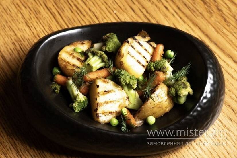 Ніжне соте з додаванням грильованої картоплі, бейбі моркви глазурованої в соусі теріякі, відварного нуту з додаванням копченої паприки, подається страва з соусом чимічурі, свіжим горошком та кропом.