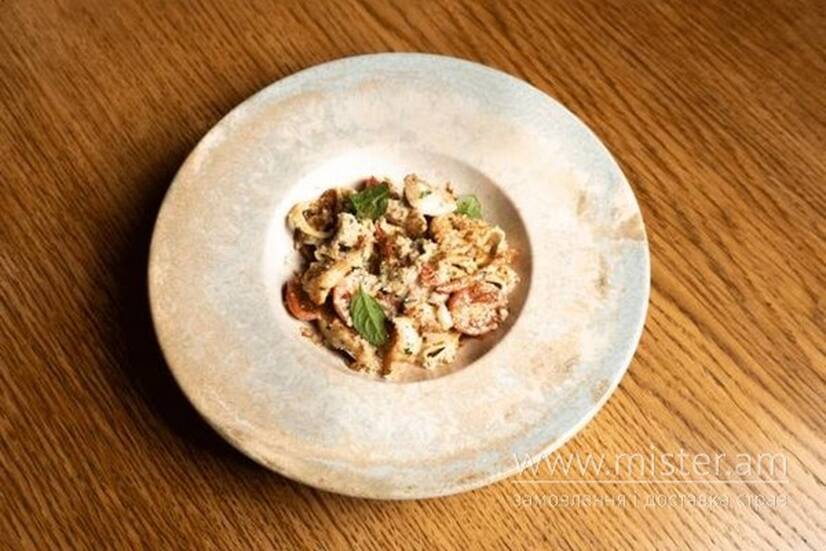 Ароматна тальятеле в легкому маслянистому соусі на основі овочевого бульйону з панцирами креветок. Поєднання креветок, морського окуня, болгарського перцю, часнику та порею створює глибокий смак. Страва доповнена вершками, свіжими спеціями та подається з пармезаном, шпинатом і «землею» з бородинського хліба.