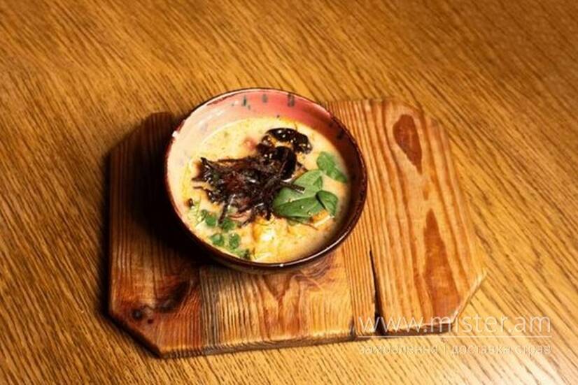 Ароматний суп на овочевому бульйоні, провареному з креветками, лемонграсом, імбиром та пастами зеленим карі й том ям. Доповнений кокосовим молоком, рисовою локшиною, овочами, грибами муер та карамелізованими креветками. Подається з кінзою, шпинатом, норі та кунжутом кімчі.